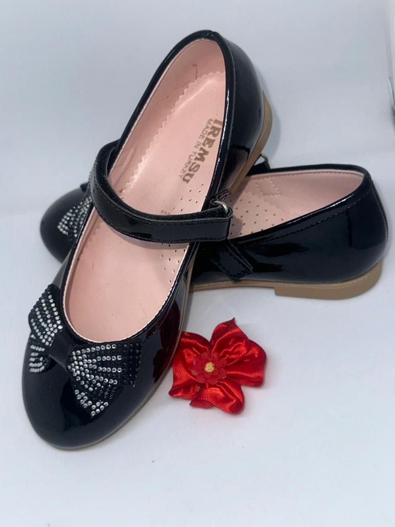 Élégantes et confortables, ces ballerines vernies noires sont parfaites pour compléter une tenue de cérémonie ou de sortie. Elles disposent d’une bride à scratch pour un enfilage facile, et d’un nœud décoratif orné de strass à l’avant pour une touche chic et brillante. Doublure intérieure rose pour plus de douceur, et semelle antidérapante pour la sécurité. Parfaites pour les mariages, fêtes, spectacles ou écoles privées.