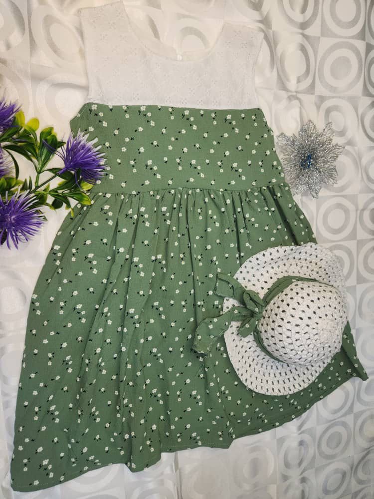 Robe Été Fille – Verte à Fleurs + Chapeau Blanc Assorti