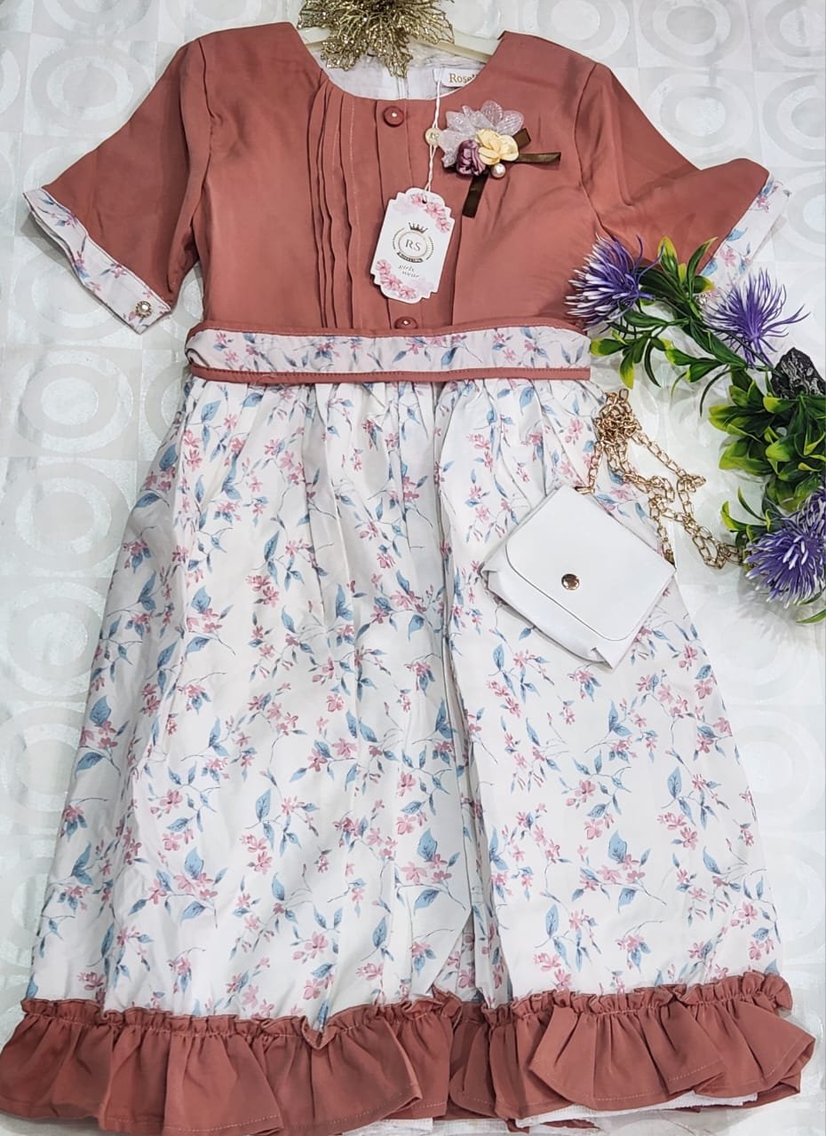 Cette robe raffinée pour fille associe un haut uni terracotta élégant à une jupe fluide blanche ornée de motifs floraux délicats. Le détail plissé sur le buste et les manches mi-longues ajoutent une touche chic et soignée. La ceinture fine marque subtilement la taille, tandis que l’ourlet volanté en rappel de couleur donne un effet harmonieux et tendance.