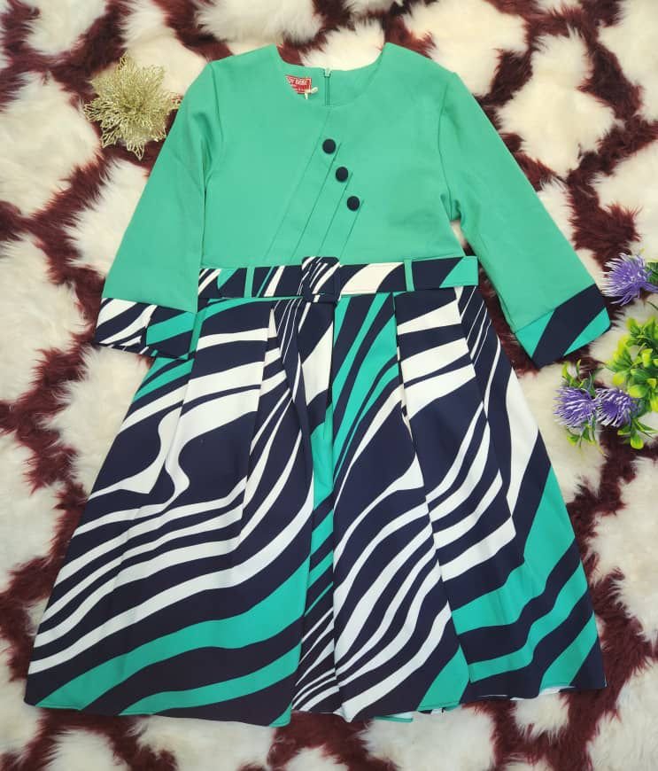 Cette robe originale et sophistiquée ravira les petites filles au style affirmé. Elle associe un haut vert menthe uni avec trois boutons décoratifs à une jupe plissée structurée à motifs graphiques ondulés dans les tons noir, blanc et vert. Avec ses manches longues et sa coupe cintrée à la taille, elle est idéale pour les cérémonies, spectacles ou événements spéciaux. Élégante, moderne et pleine de caractère.