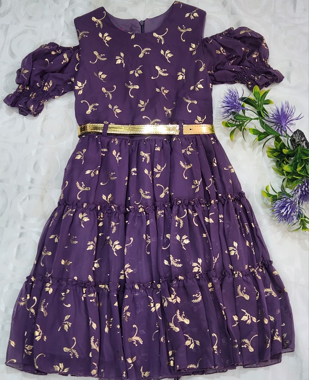 Cette robe élégante en tissu violet profond est sublimée par des motifs dorés raffinés qui apportent une touche festive et sophistiquée. Ses manches bouffantes élastiquées ajoutent du volume et du charme, tandis que la coupe évasée à plusieurs volants assure un tombé fluide et gracieux.