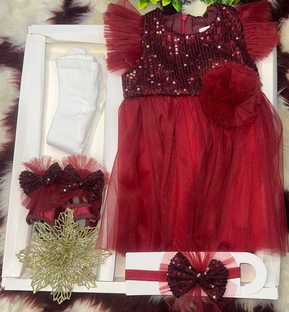 Sublimez votre petite princesse pour une occasion spéciale avec cette tenue de cérémonie complète couleur bordeaux. L’ensemble comprend une robe élégante en tulle avec bustier à sequins, une paire de chaussettes blanches, un bandeau assorti orné d’un nœud pailleté, ainsi que des sandales bébé coordonnés. Une tenue idéale pour un baptême, un anniversaire ou toute célébration festive. Confort et élégance réunis pour faire briller bébé.