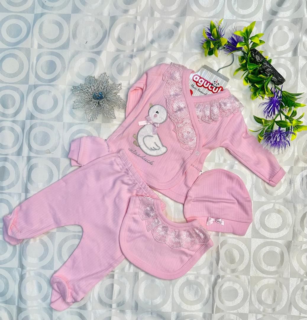 Trousseau Naissance Fille – 3 Pièces Rose avec Motif Cygne & Dentelle