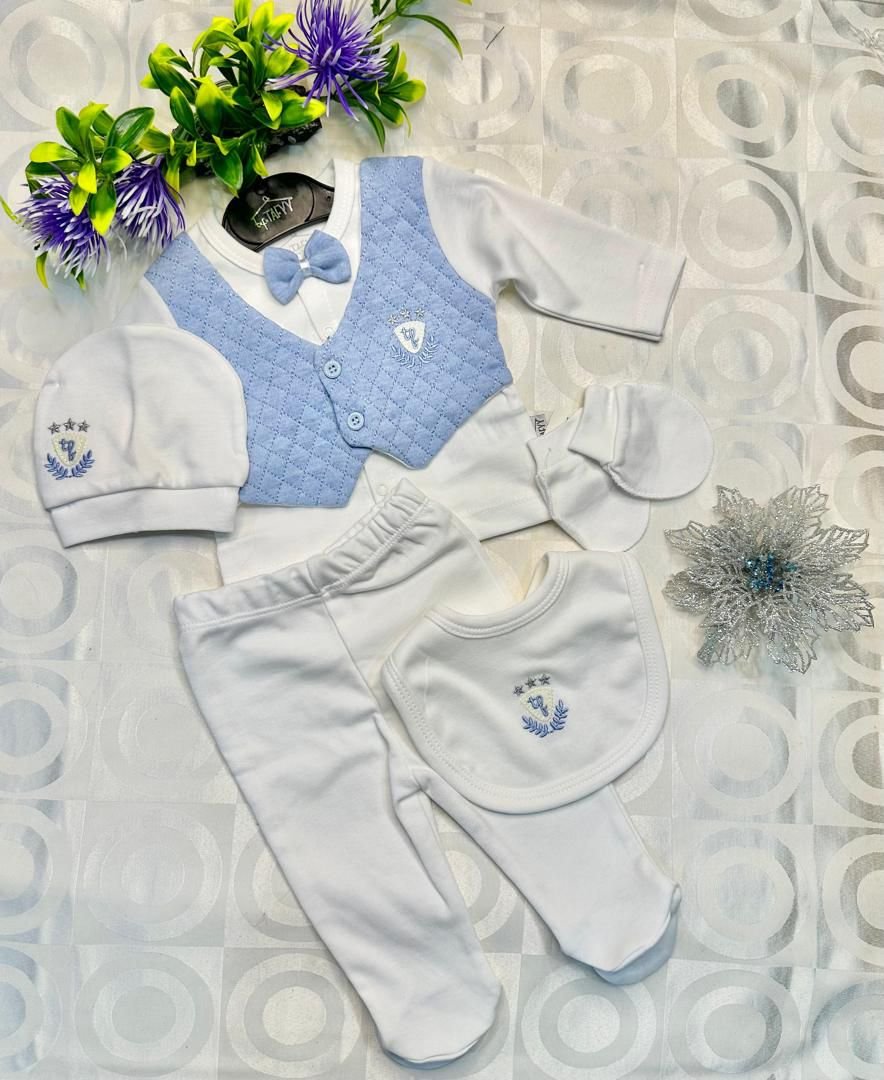Cet élégant trousseau de naissance 5 pièces est idéal pour accueillir votre petit prince avec style. Composé d’un haut blanc avec gilet bleu intégré et nœud papillon cousu, d’un pantalon à pieds, d’un bonnet assorti, d’un bavoir brodé et d’une paire de moufles. Les détails brodés et les finitions douces en font une tenue parfaite pour les premiers jours, les séances photos ou comme cadeau de naissance raffiné.